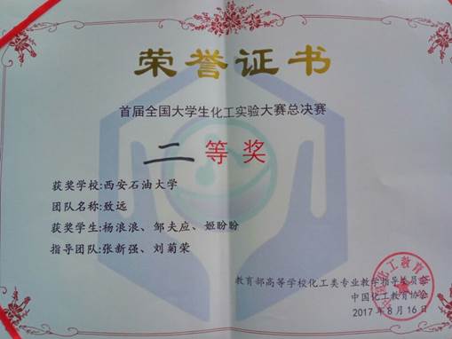 7月10日-11日,在中北大学举办的首届全国化工实验大赛(西北赛区)初赛中,公司2支代表队与来自新疆、甘肃、青海、宁夏、陕西、山西省(自治区)的43支代表队同台竞技,获得了特等奖和一等奖的成绩,由杨浪浪、邹夫应、姬盼盼组成的致远队成功晋级全国总决赛。