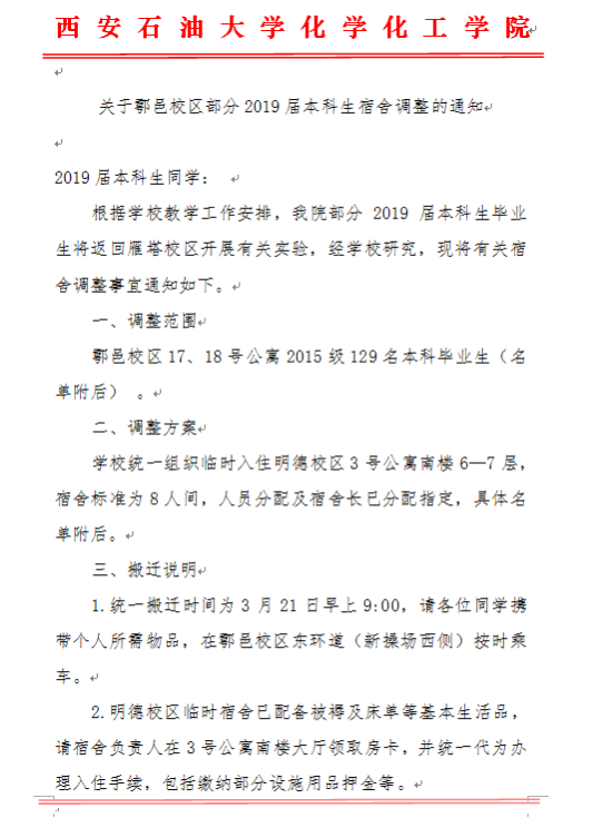 【员工管理】关于鄠邑校区部分2019届本科生宿舍调整的通知